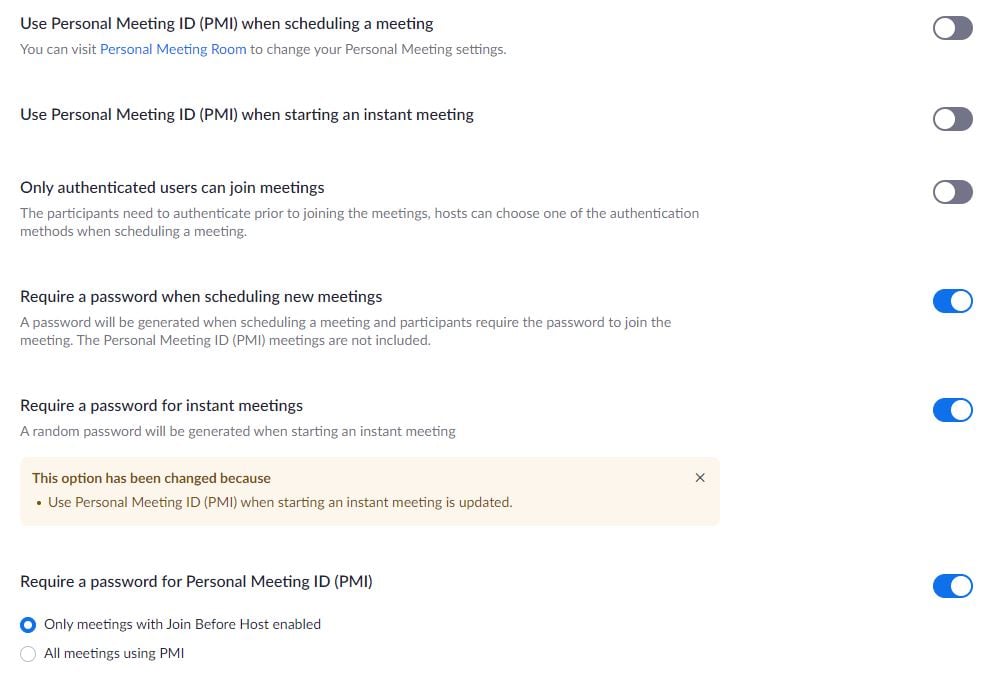 Basic Zoom users will have passwords on their meetings enabled by default as of early April 2020. If you manage a Zoom account for your friends or family, you should review your management dashboard. You may need to manually enable security features to be turned on for users by default. You can find these features in your Zoom dashboard under security. We highly suggest setting up these security features to be enabled by default for all users in your account. If you are not the admin of your account these features may not be available for you to edit.